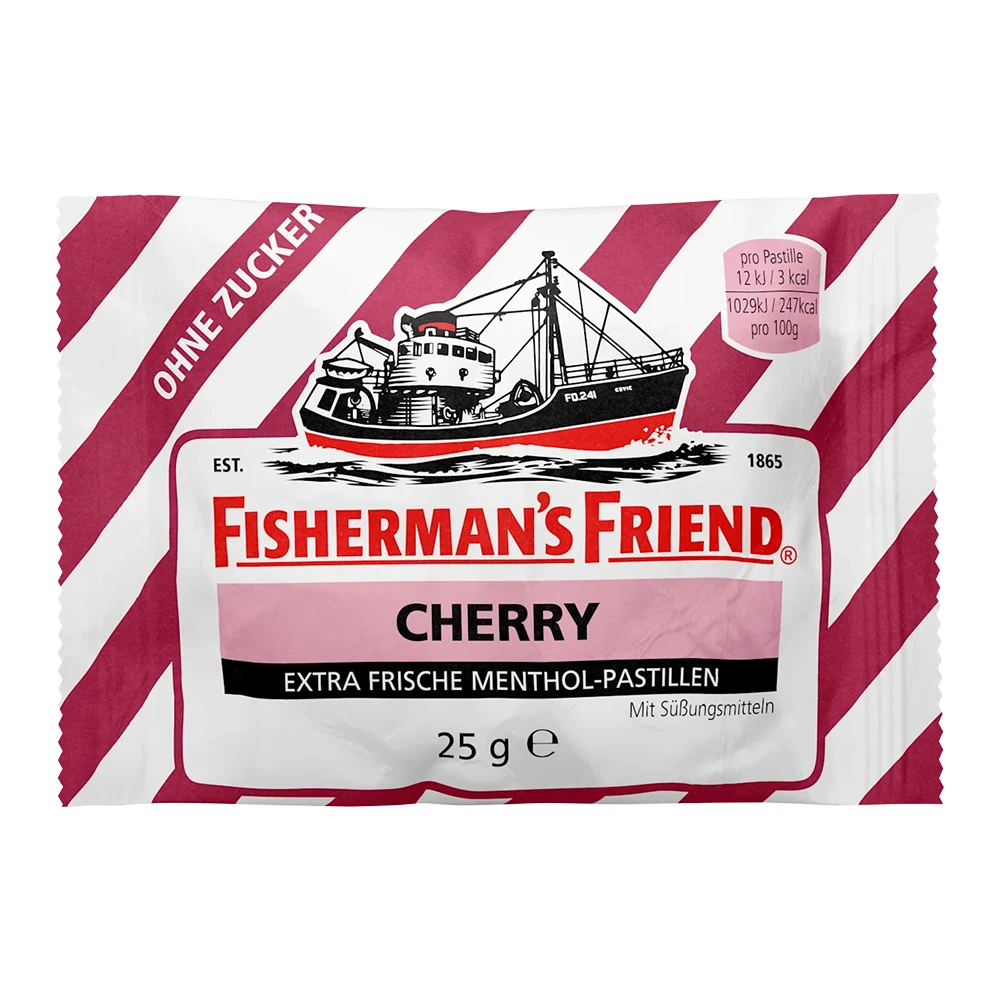 Fisherman’s Friend Kirsche sind aromatische Bonbons mit intensivem Kirschgeschmack und wohltuender Menthol-Frische. Ideal für unterwegs, bei Erkältung oder einfach für frischen Atem.