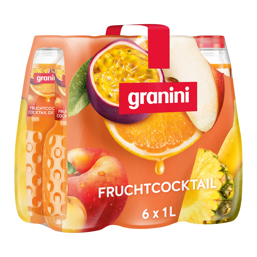 Granini Frucht-Cocktail vereint verschiedene Früchte wie Apfel, Orange, Ananas, Mango und Maracuja zu einem fruchtig-exotischen Geschmackserlebnis. Leicht süß, vollmundig und erfrischend – ideal pur, auf Eis oder als Basis für Cocktails.