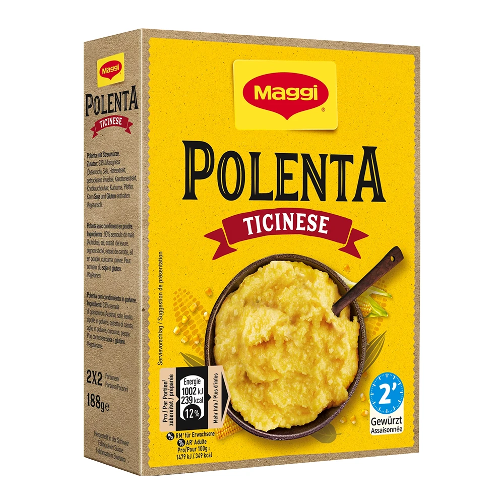 Die Maggi Polenta ist eine feine Maisgrieß-Mischung für die schnelle und unkomplizierte Zubereitung klassischer Polenta. Einfach mit Wasser oder Milch aufgekocht, entsteht eine cremige, geschmackvolle Basis für Beilagen, Gratins oder Aufläufe.