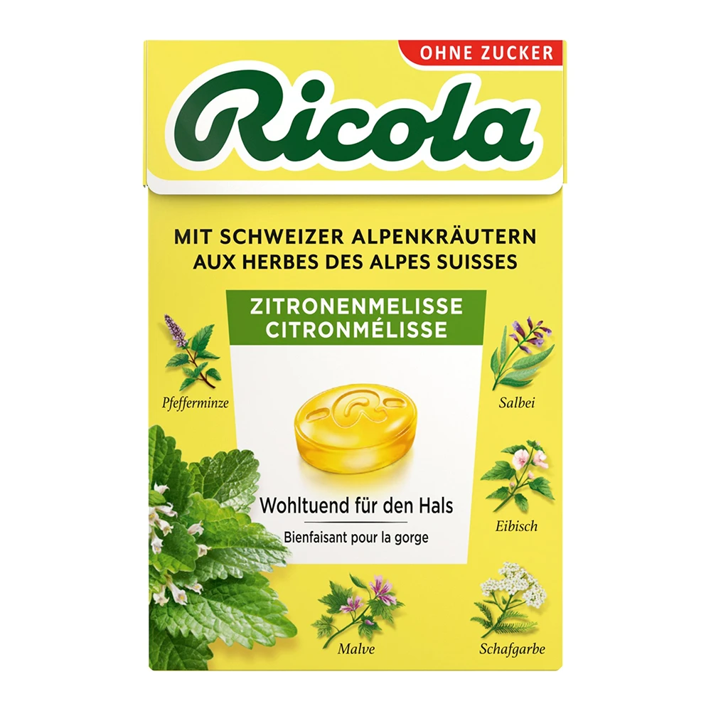 Ricola Zitronenmelisse bietet zuckerfreie Kräuterbonbons mit erfrischendem Zitronenmelisse-Geschmack. Ideal zur Beruhigung von Hals und Atem unterwegs oder zwischendurch.