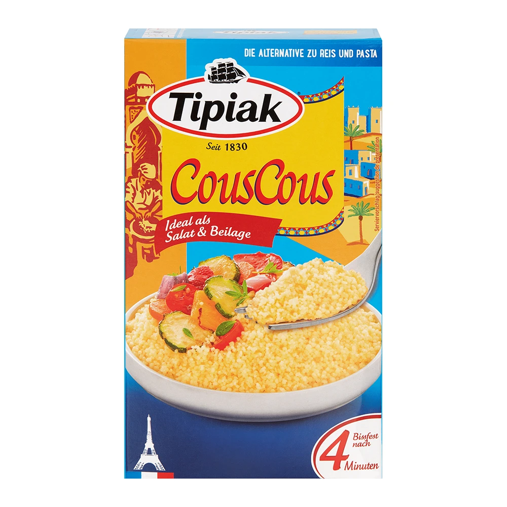 Tipiak CousCous ist ein feiner Weizengrieß aus hochwertigem Hartweizen. Schnell zubereitet und vielseitig kombinierbar für Salate, Beilagen oder Hauptgerichte.
