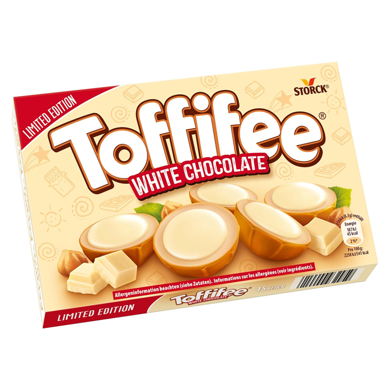 Toffifee White Chocolate ist die edle Variante des Klassikers: knackiges Karamellschälchen mit ganzer Haselnuss, cremigem Nougat und einer feinen Schicht weißer Schokolade. Das perfekte Zusammenspiel von nussig, karamellig und cremig-süß macht diese Edition zu einem besonderen Genuss. Ideal für Fans weißer Schokolade oder als abwechslungsreiche Ergänzung zum Original.